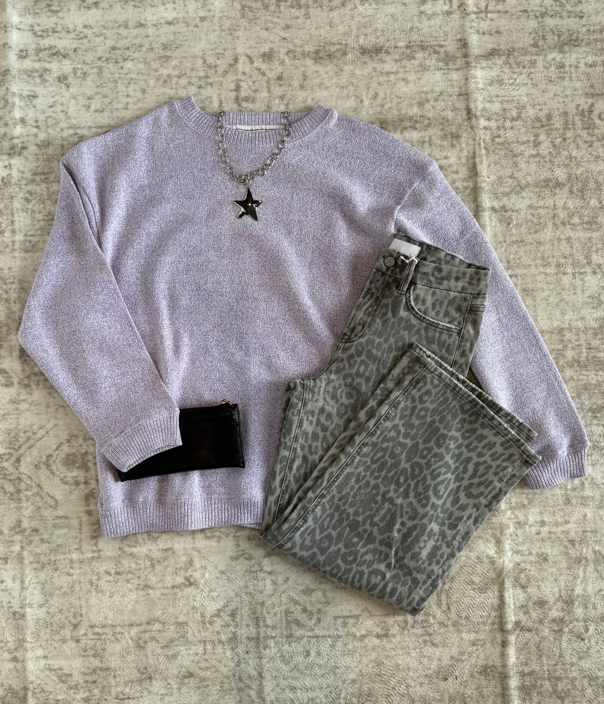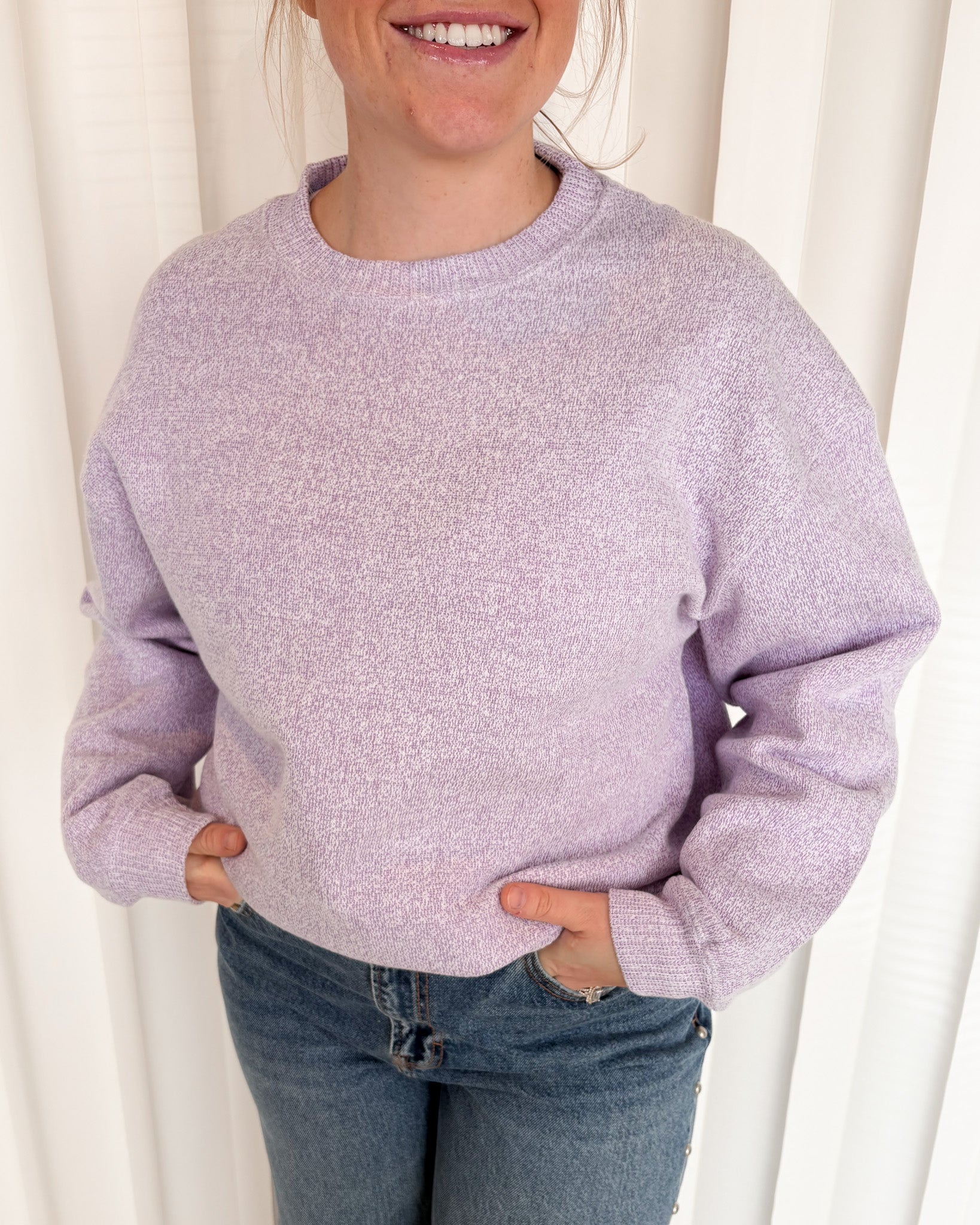 Crew oversized sweatshirt fit. Textured heather look in grape color. Buttery soft inside.